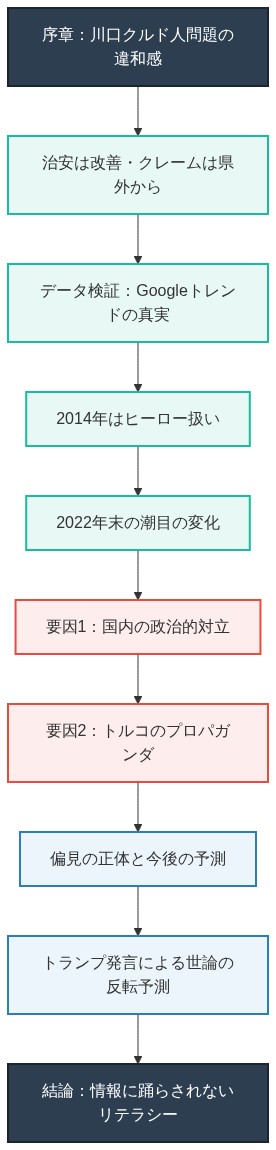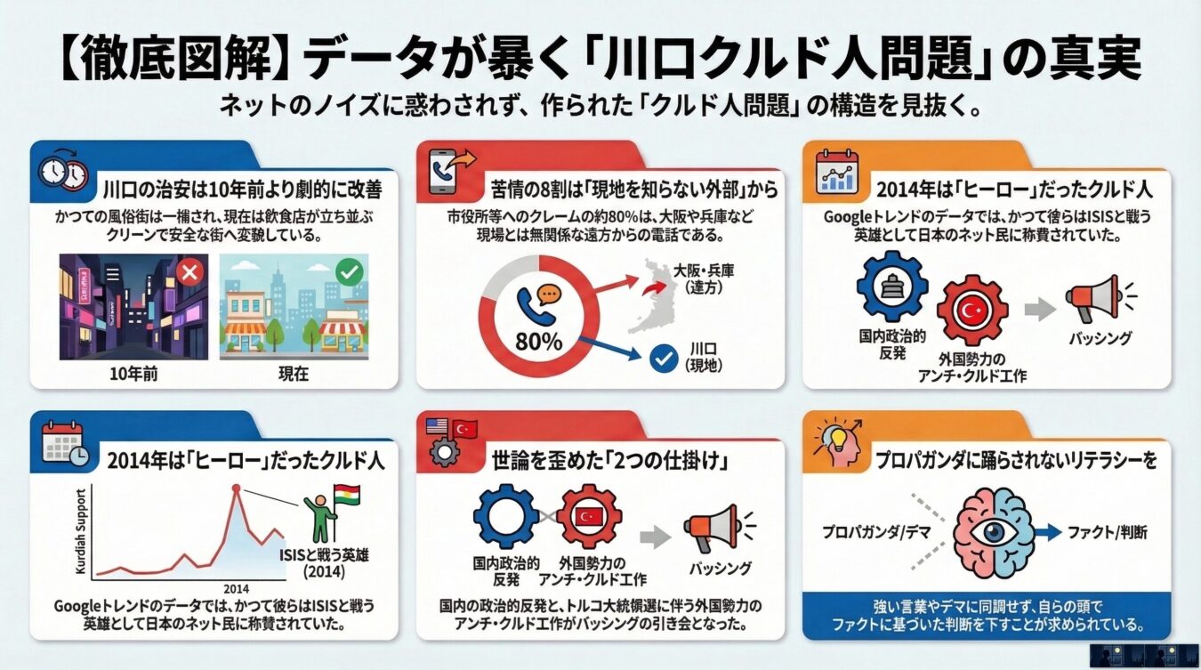 【結論】 ネット上で騒がれている「川口クルド人問題」は、客観的なデータや現地の事実とは乖離した「作られたデマ」である。これは国内の政治的対立と、外国勢力(トルコ)のプロパガンダが複雑に絡み合って生み出されたものであり、事実を確認せずに感情論で踊らされている現状には強い警戒が必要である。