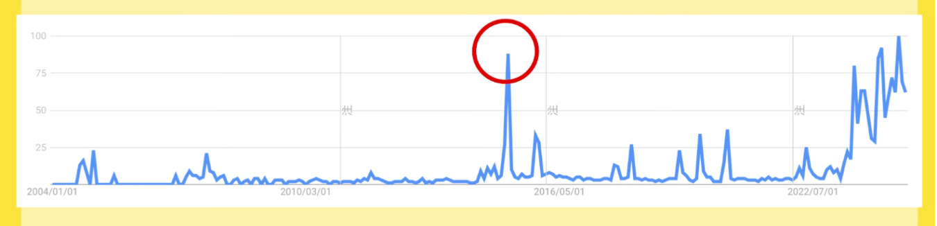 Googleトレンドでクルド人というキーワードの過去20年間の検索推移を見ると、現在の盛り上がりの前に、2014年頃に明確なピークが存在する。
