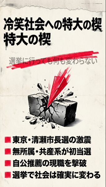 「野党はだらしない」「選挙に行っても何も変わらない」——そんな冷笑主義が蔓延する日本社会に、特大の楔(くさび)が打ち込まれた。東京・清瀬市の市長選において、無所属で共産・社民が推薦する原田ひろみ氏が、自公推薦の現職を破り初当選を果たしたのだ。