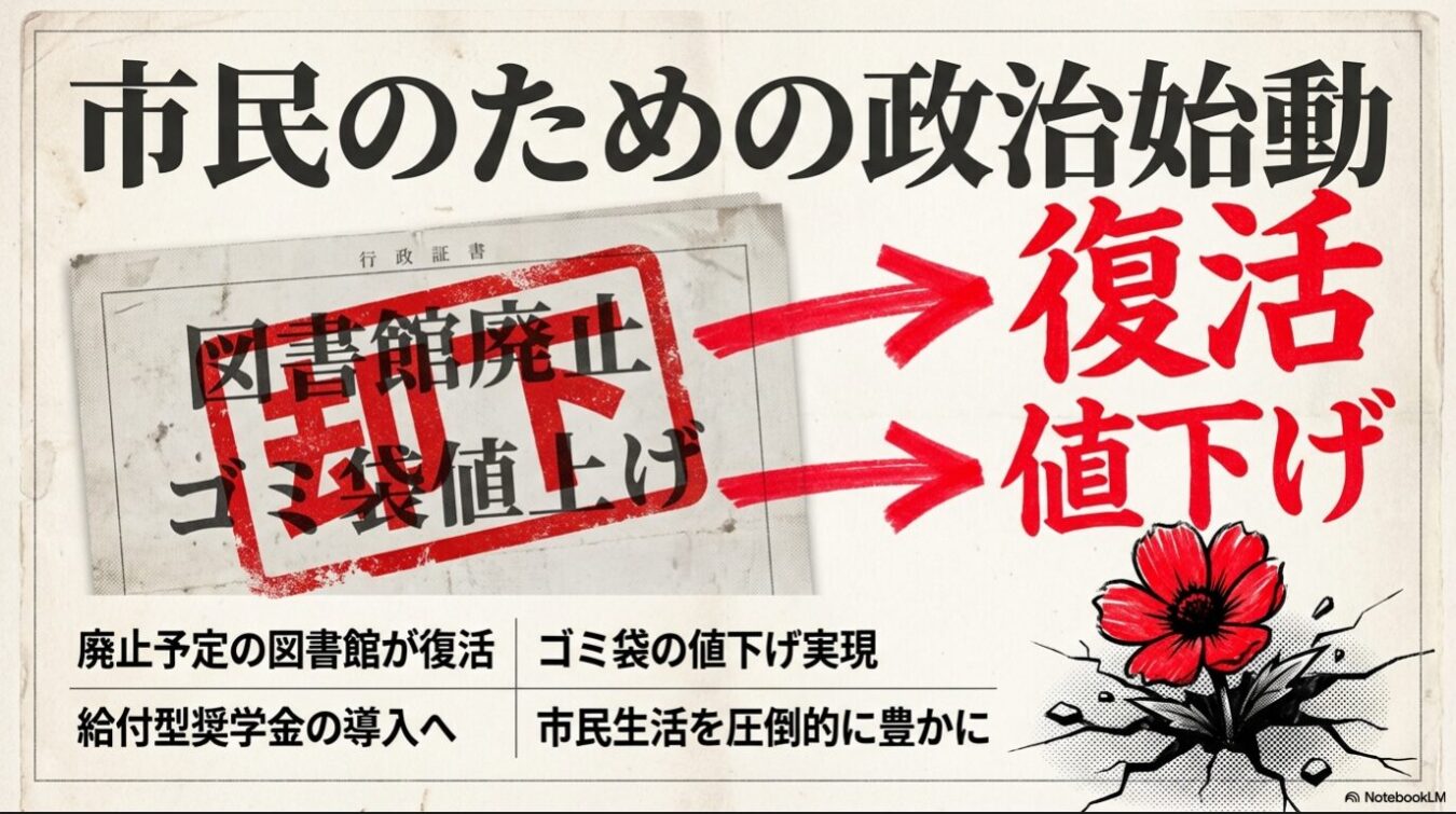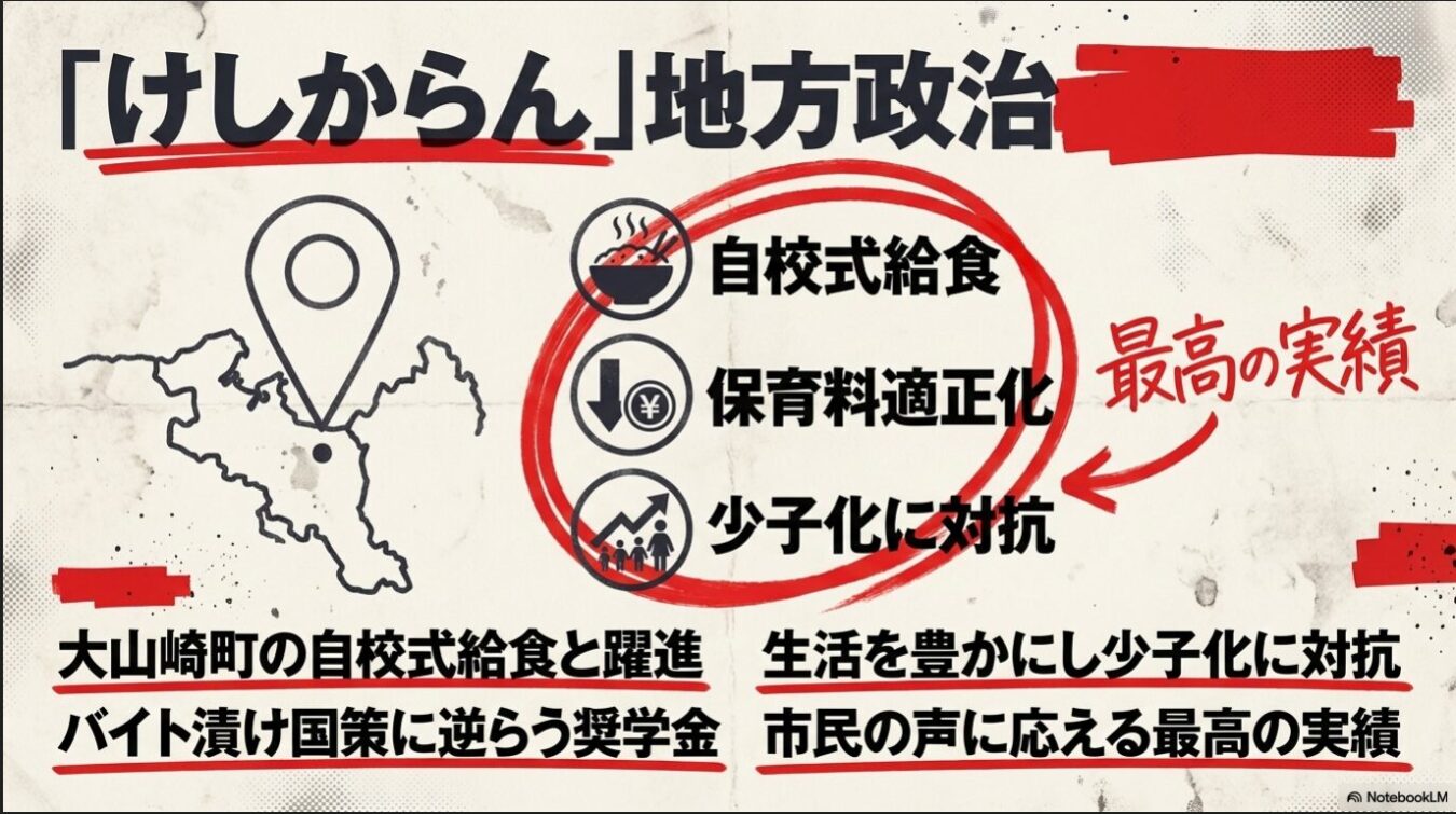 共産党系の首長が誕生したことで、無くなるはずだった図書館が復活し、値上げ予定だったゴミ袋が安くなり、さらには給付型奨学金まで始まろうとしている。少子化と若者の困窮を放置してきた現政権の姿勢に真っ向から抗い、市民のための政治を実現しようだなんて、まったく「実にけしからん(最高だ)」と言わざるを得ない。