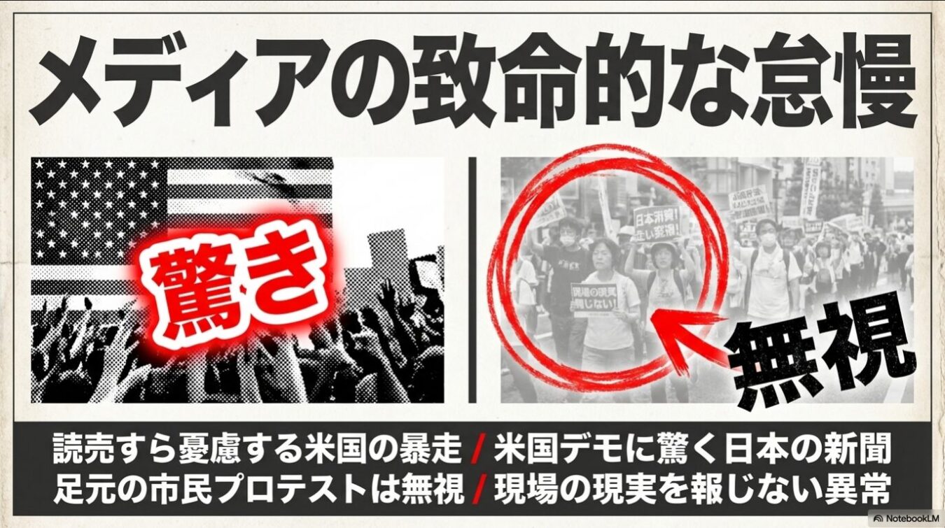 しかし、日本の新聞の致命的な怠慢はここからだ。海の向こうのデモには過敏に反応するくせに、自分たちの足元で広がる抗議の声——例えば新宿で行われたプロテストレイブや、官邸前で声を上げる市民の存在——を完全に無視しているのである。日本にも、センス良く声を上げる市民は確実に存在している。メディアは驚いている暇があったら現場へ行き、現実を報道する義務を果たせ。