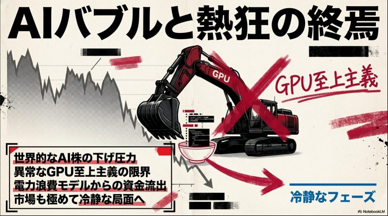 AI株の調整局面と「GPU至上主義」の終わり 政治の世界で「絶対的な権力」の綻びが見え始めたように、経済の世界でも一つの熱狂が転換点を迎えている。視点をマーケットに移そう。日経新聞3面が報じる通り、世界的にAI株への強烈な調整(下げ圧力)が入りつつある。