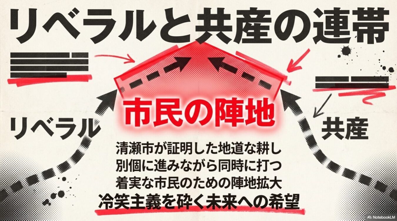 【結論】 メディアが意図的に報じない「国内政治の停滞の真の理由(自民党内部のサボタージュ)」や「国内で声を上げる市民の存在」を直視せよ。10年前の野党の徹底抗戦が現在の防波堤になっている事実や、清瀬市で誕生した共産党系市長の「市民生活を最優先する(自民党にとっては実にけしからん)」政策を見れば、リベラルとコミュニストの地道な連帯が、確実に日本の政治を裏側から動かし始めていることがわかる。