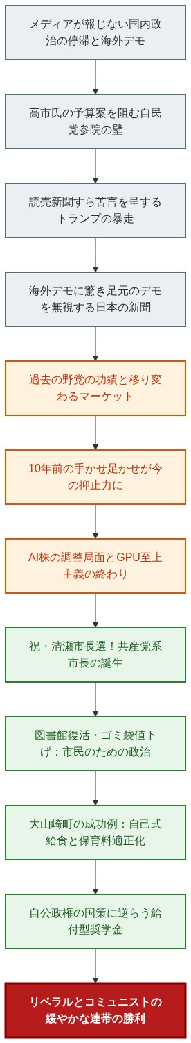 【結論】 メディアが意図的に報じない「国内政治の停滞の真の理由(自民党内部のサボタージュ)」や「国内で声を上げる市民の存在」を直視せよ。10年前の野党の徹底抗戦が現在の防波堤になっている事実や、清瀬市で誕生した共産党系市長の「市民生活を最優先する(自民党にとっては実にけしからん)」政策を見れば、リベラルとコミュニストの地道な連帯が、確実に日本の政治を裏側から動かし始めていることがわかる。