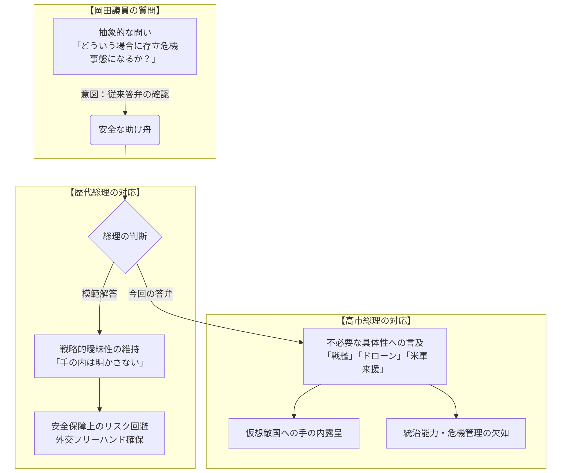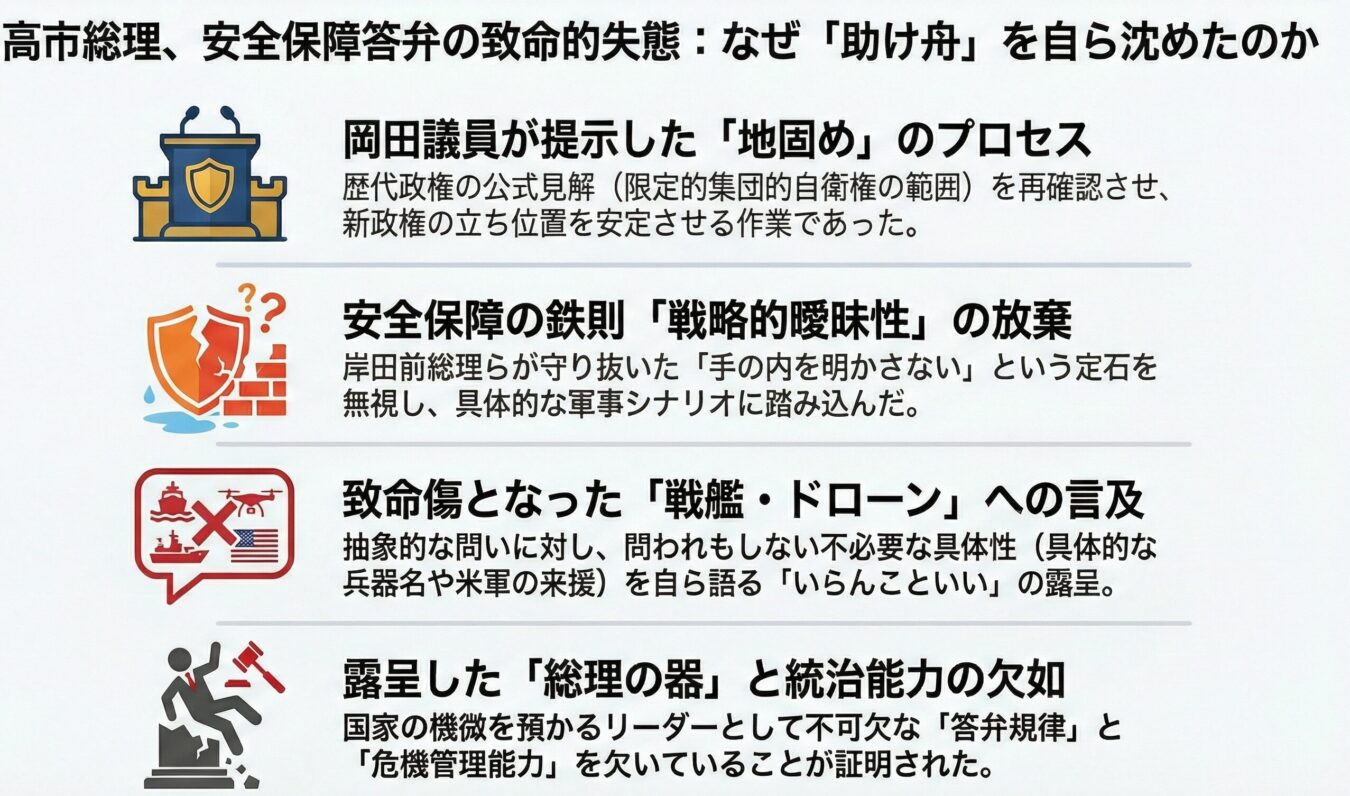 1. 助け舟の無視:岡田議員の質問は、新政権の解釈が従来通りであることを確認する「地固め」であり、本来は高市氏を守るための簡単な問いだった。