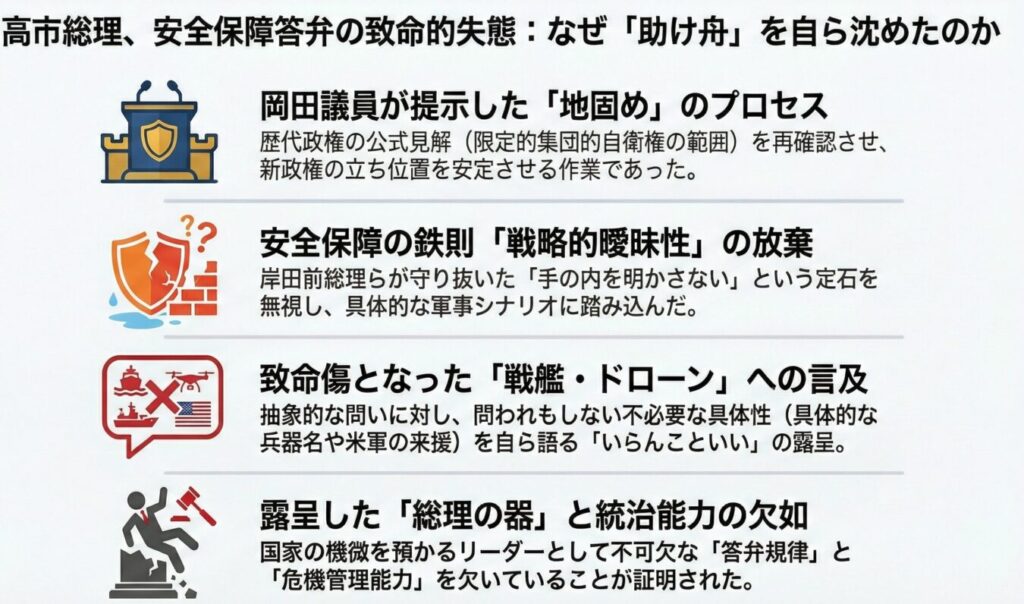 【結論】 高市早苗総理の国会答弁における失態は、岡田克也議員による「罠」ではなく、高市氏自身の「統治能力の欠如」による自爆である。岡田氏は歴代政権の解釈を確認する「助け舟(定石)」を出したが、高市氏はその意図を理解できず、本来秘匿すべき軍事シナリオ(戦艦やドローン)を具体的に語るという、安全保障の鉄則である「戦略的曖昧性」を自ら破壊する致命的なミスを犯した。