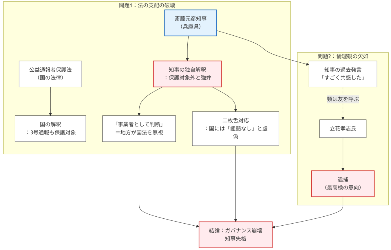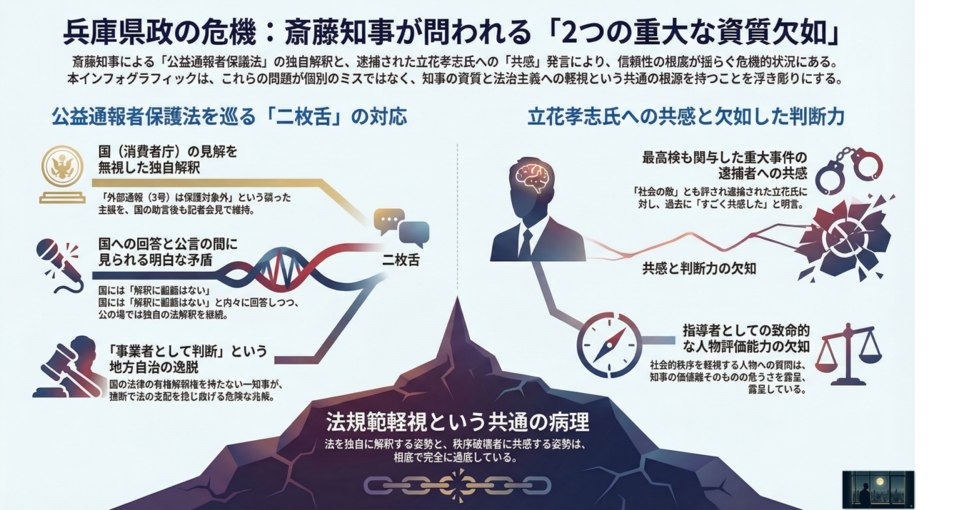 兵庫県の斎藤元彦知事を巡る一連の問題は、単なる地方自治体のスキャンダルの枠を超え、日本の民主主義における『法の支配』と『政治倫理』のあり方を問う深刻な事態となっている。本稿では、知事の行政執行の正当性に関わる『公益通報者保護法の解釈問題』と、知事の政治 行政上の 判断力の欠如を示唆する『立花孝志氏への共感発言』という、一見別個に見えて根底で繋がっている二つの論点に焦点を当てる。これらの問題は個別の事案として片付けられるものではなく、斎藤知事の政治家としての資質、そして兵庫県政のガバナンスそのものが問われるべき喫緊の課題である。
