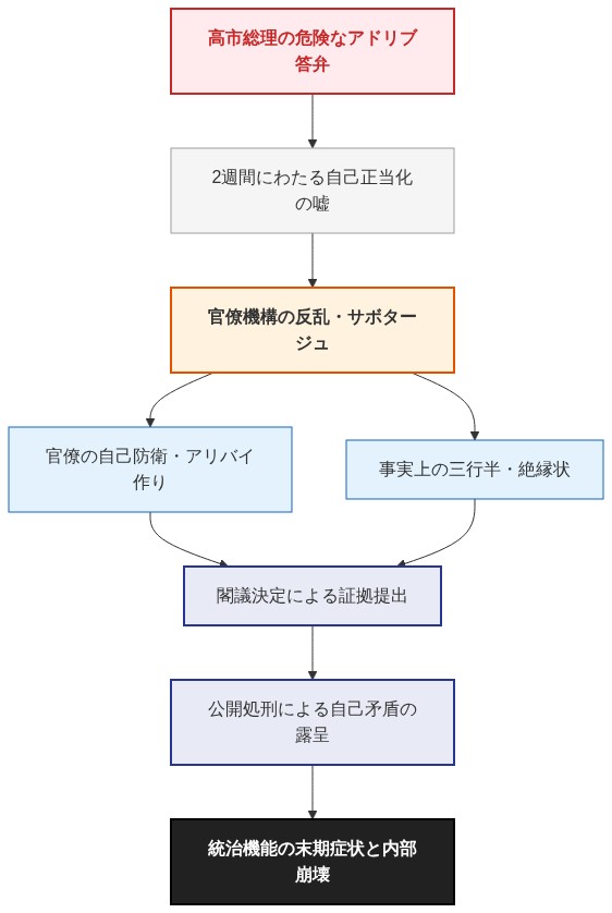 【結論】 高市総理による「台湾有事」を巡る国会でのアドリブ答弁と、それを糊塗するための度重なる虚偽は、単なる失言問題ではない。自らの保身を優先するトップに対し、官僚機構が「閣議決定」という究極の手続きを用いて反乱を起こしたという、日本政府の統治機能が内部から完全に自壊している様を証明する歴史的異常事態である。