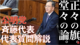 • 斎藤代表の評価: また、公明党の斎藤代表による国会での代表質問は、他の政党(山本太郎氏や野田佳彦氏など)の質問が「幼稚園児以下」であると厳しく批判される中で、**「唯一代表質問を代表質問垂らしめていた」**と高く評価されています。斎藤代表の質問は、高市早苗氏が「嫌な気持ちになる」という基本コンセプトを徹底したものだったと評されており、その迫力は「迷いのない人間が出せる迫力」だと分析されています。