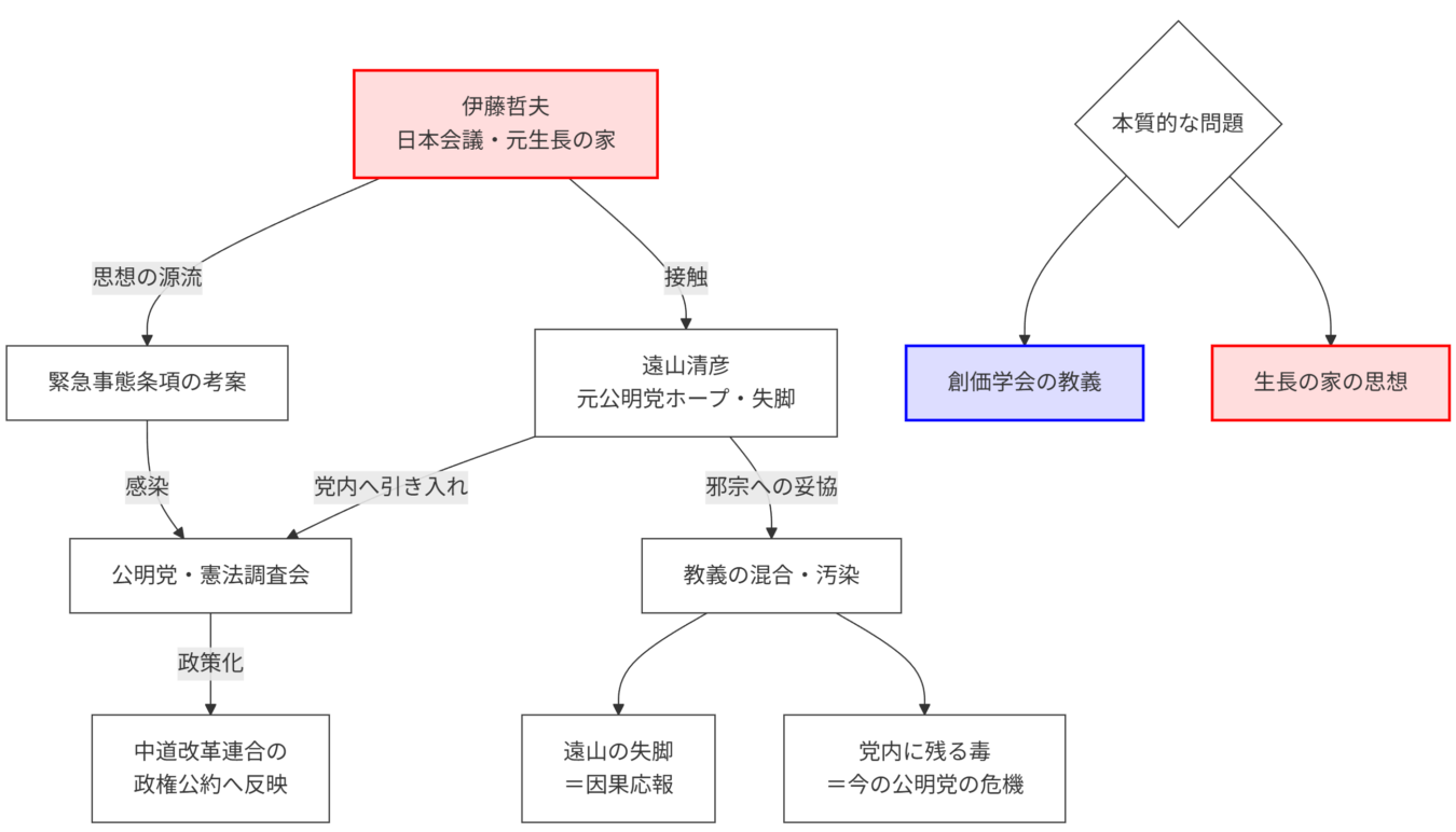 【結論】 遠山清彦が去った後も、公明党内には「伊藤哲夫(元・生長の家学生運動家)」が考案した「緊急事態条項」という名のウイルスが残留している。公明党や中道改革連合が「現実的対応」として掲げる改憲案は、実は創価学会が最も警戒すべき「右派宗教運動」の理論そのものであり、学会員は知らず知らずのうちに敵対思想の片棒を担がされている。