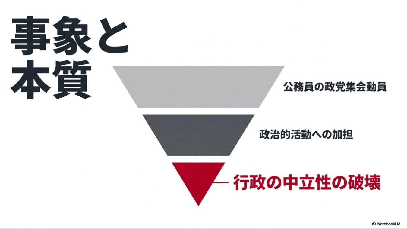 問題の本質は、「公職にある公務員が、特定の政党の私的な集会に動員されて、政治的活動に加担している」という、このグロテスクな事実そのものなんですよ 。