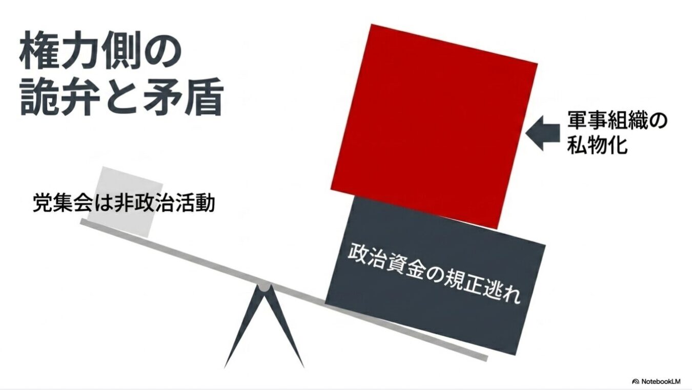 自分たちの都合のいい時だけ「これは政治活動ではない」と逃げを打ち、軍事組織を私物化する 。この理屈の通らなさが、国家のガバナンスを根本から腐らせていくんです 。