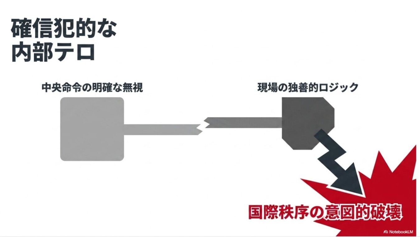 あいつはそう嘯いた。これは事故でもなんでもない、辞書通りの意味での「確信犯的テロ」です 。彼らの頭の中には、「東京の大本営の連中は現場も国家も分かっていない。国家を愛する俺たち現場の人間が、命令を無視してでも国家経営をひっくり返さなければならない」という独善的なロジックがありました 。