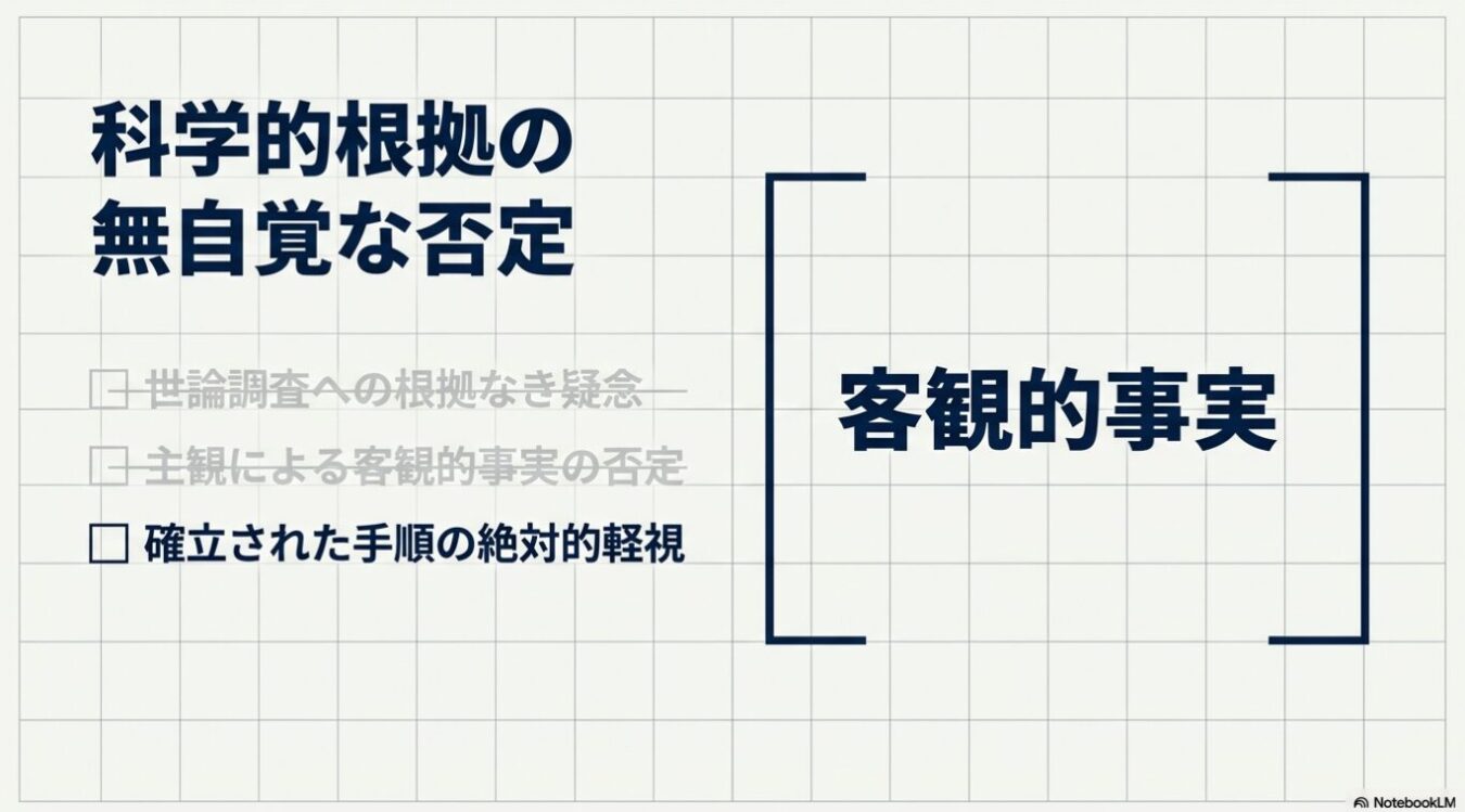 「科学的根拠の無自覚な否定」という見出しの下に、「世論調査への根拠なき疑念」「主観による客観的事実の否定」「確立された手順の絶対的軽視」という項目が並び、その右側に括弧で囲まれた「客観的事実」という言葉が配置されたスライド。