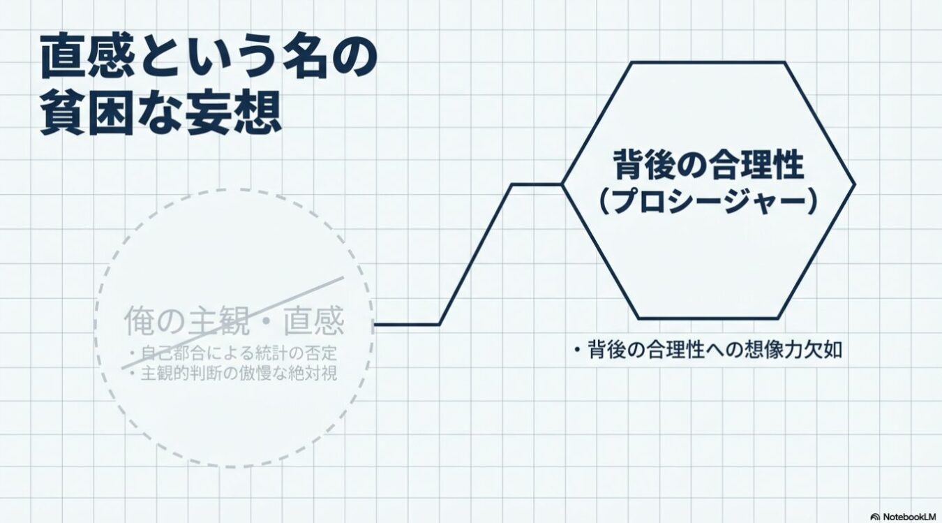 「直感という名の貧困な妄想」というタイトルの下、破線円で囲まれた「俺の主観・直感」と、六角形で囲まれた「背後の合理性(プロシージャー)」の対比関係が線で結ばれ、各要素の補足説明が記載された図解。