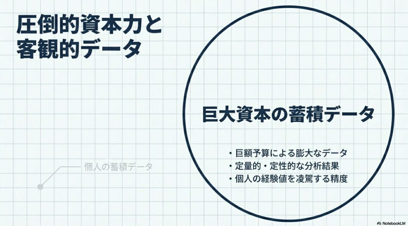巨大資本による膨大なデータの蓄積が、個人の蓄積データを圧倒している様子を示す対比図。