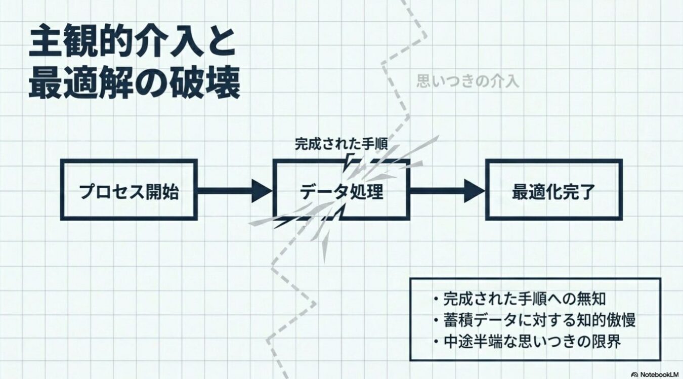 「主観的介入と最適解の破壊」というタイトルで、最適化プロセスの中核である「データ処理」が、外部からの「思いつきの介入」によって破損させられる様子と、その原因である無知、知的傲慢、中途半端な思いつきを示した図解。