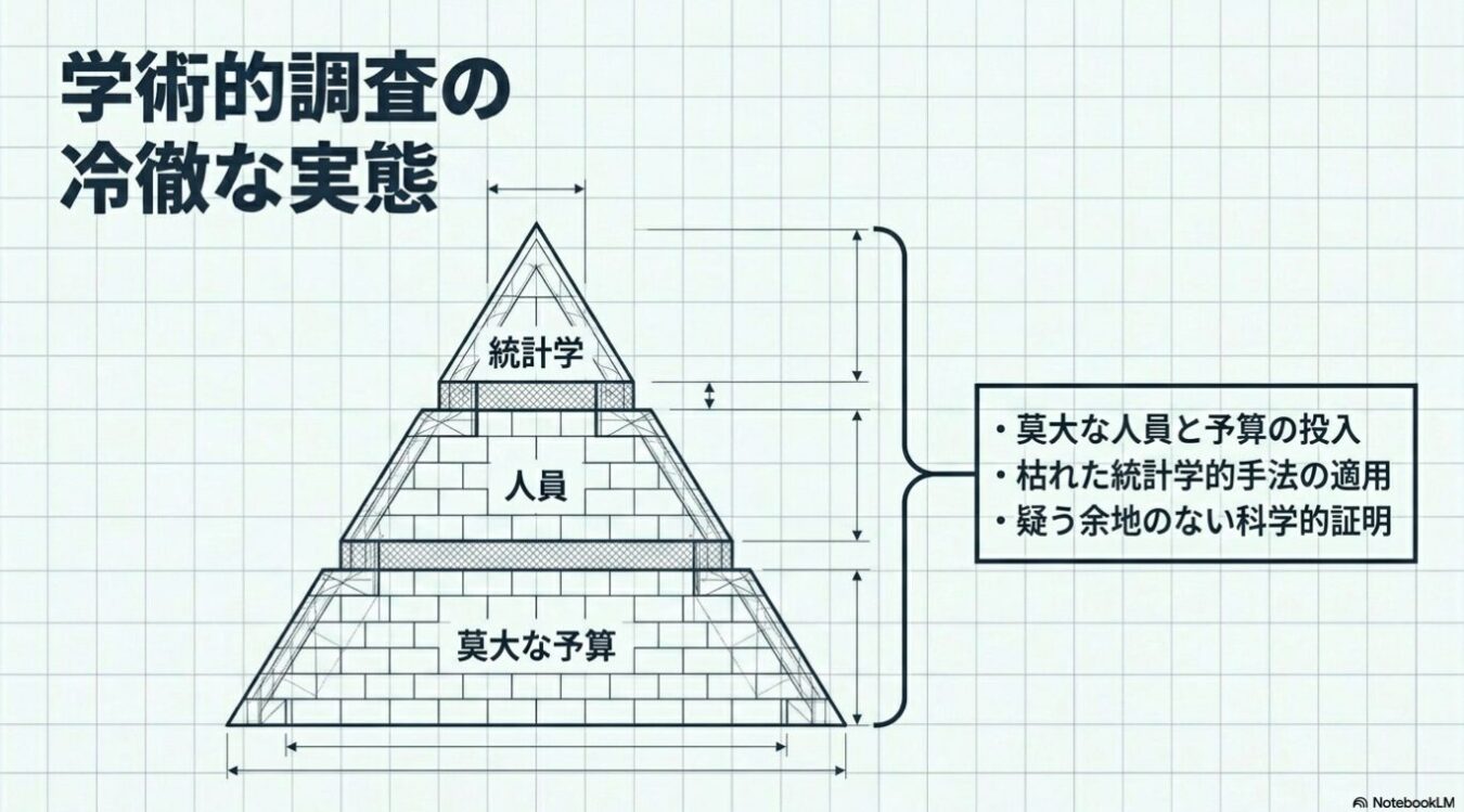「学術的調査の冷徹な実態」というタイトルのもと、統計学、人員、莫大な予算の3階層からなるピラミッド図に、大規模なリソース投入と科学的証明の正当性を説明するテキストが添えられた図解。