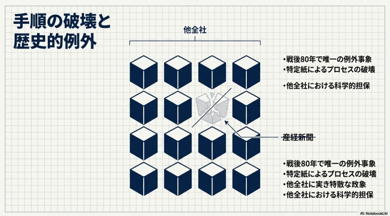 「他全社」というラベルが付けられた16個の立方体のうち、1つが破損し、その破損箇所が「産経新聞」であることを示しながら、「手順の破壊と歴史的例外」というタイトルとそれに関連する説明書きが配置された図。