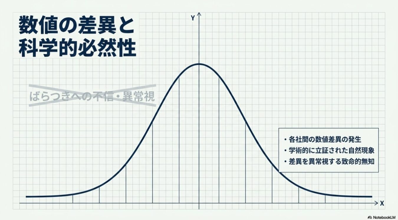 正規分布曲線を描いたグラフと、「数値の差異と科学的必然性」というタイトル、および「ばらつきを異常視する致命的無知」等のメッセージが記された図解。