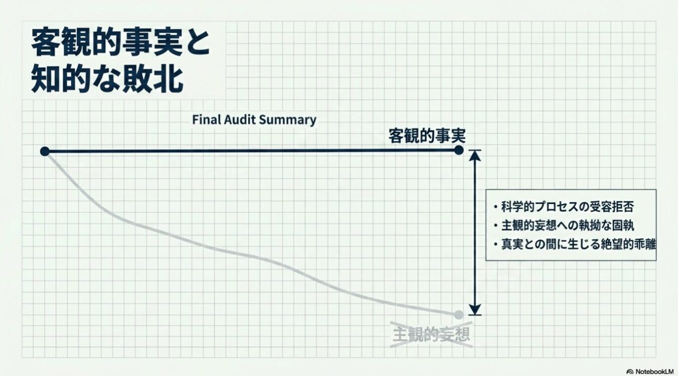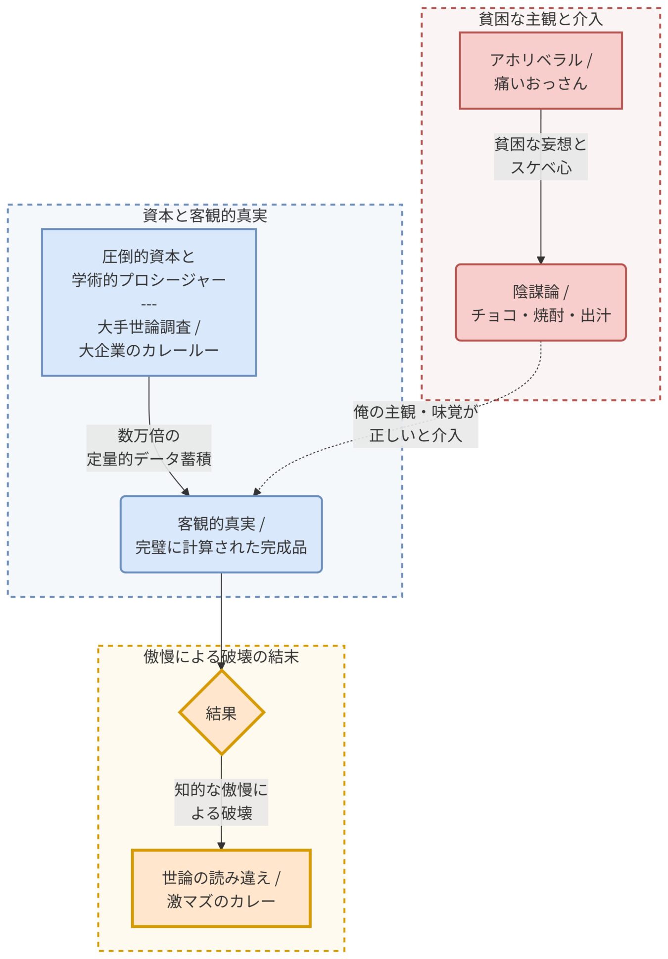 「資本と客観的真実」に基づく論理的なプロセスが、「貧困な主観」による介入によって「知的傲慢」を招き、最終的に「世論の読み違え」という破綻に至る構図を示したフローチャート。