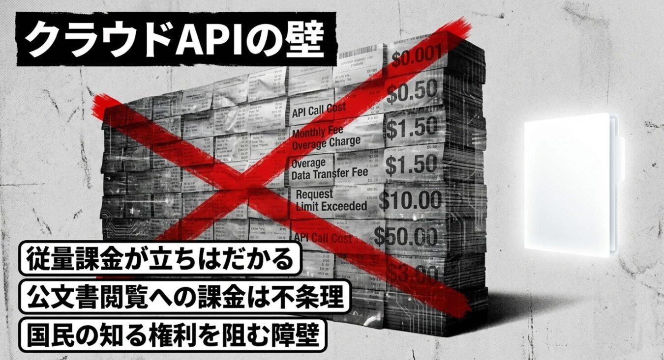 しかし、ここに巨大な壁が立ち塞がった。通常、OpenAIやAnthropicなどのAPIを使ってシステムを組むと、1トランザクションあたり0.001ドルといったコストが容赦なく吸い取られていく。考えてもみてほしい。これは政府の公文書だ。国民が知るべき事実を読み解くためだけに、いちいち課金されるなど、到底納得できるものではない。アホらしいにも程がある。