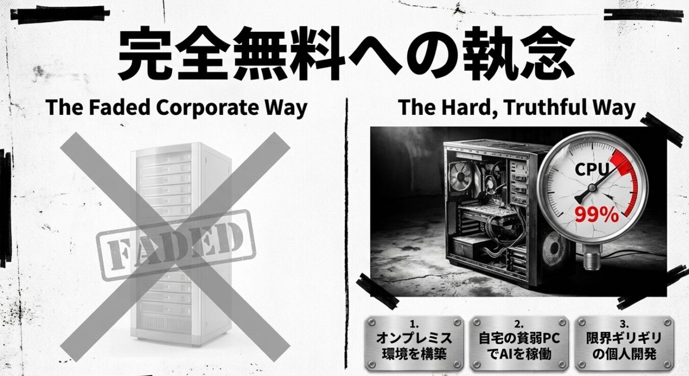 1. 大手APIの理不尽なコスト障壁を打破するため、ローカルLLM(オンプレミス)での稼働という泥臭い手法を選択。