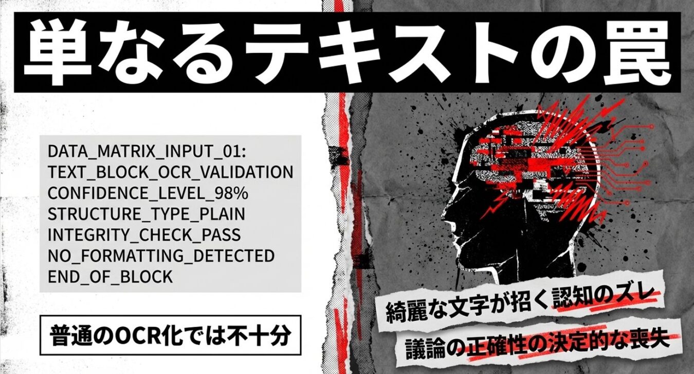 だから私は、画像化という逃げ道を断ち、AI-OCRを活用してテキストベースでありながら「元の紙のファイルの質感」を再現するようAIに組み直させた。あの重苦しい「黒塗り」の事実を正確に視覚化し、黒いプチプチだけを除去しつつ、実物のファイルで議論しているのと同じ「ルック&フィール」を蘇らせたのだ。