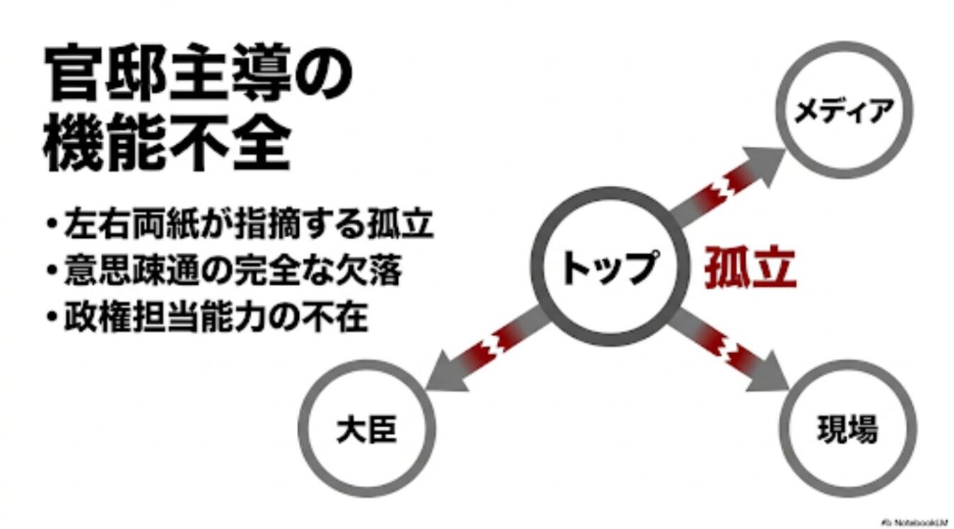 - 孤独の官邸主導: 他の大臣と全く意思疎通ができず、日経新聞に「経験半年 自分の仕事で精一杯」と政権担当能力ゼロを突きつけられる異常事態。