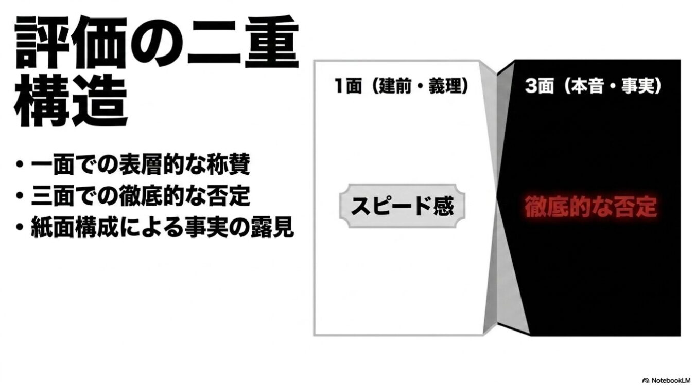 しかし、そのまま紙面をペロッとめくって3面を見てください 。そこには「首相に法案整備難題」とデカデカと書かれています 。中身を読めば「お前、結局何にもしてへんやんけ」とケチョンケチョンに突き放しているのです 。1面で「スピード感」と持ち上げておいて、めくった3面で「何も進んでいない」と落とす 。これこそが、紙の新聞ならではの極上の表現技法(芸)なのです 。