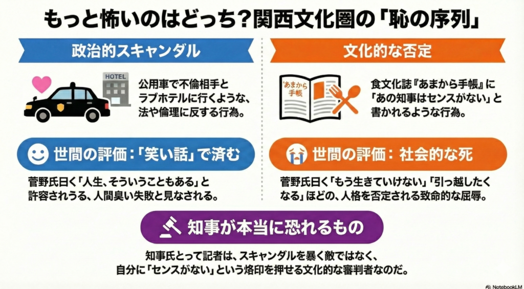 - 耐えられる恥(政治的な死) 過去、ある知事が「公用車でラブホテルに行き、週刊誌に報じられる」という、究極の公私混同スキャンダルを起こした。これは政治的には一発アウトの絶対悪である。しかし菅野氏によれば、関西の文化圏において、これは政治的な死であっても、人間的な尊厳を完全に破壊するものではない。「欲望に負けた」という人間臭い失敗として、「人生、そういうこともある」と、ある種の笑い話にすらなり得る「許容範囲内の恥」なのだ。