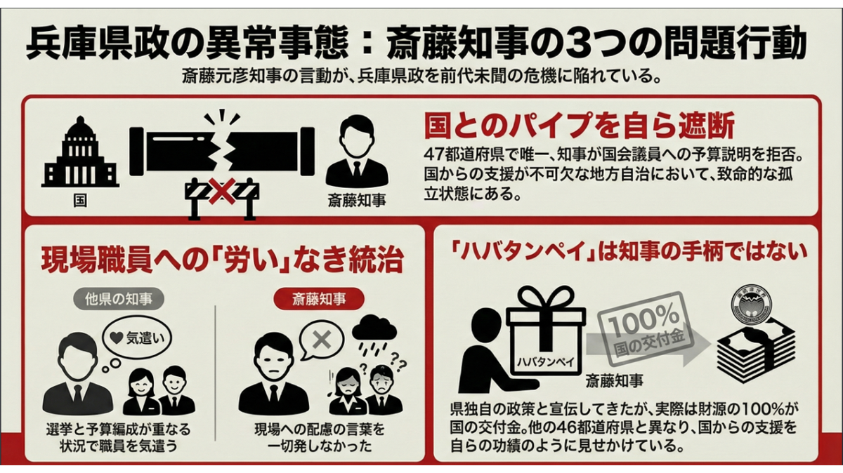 通常、知事は予算編成期になると、地元の国会議員に対して予算の説明や要望を行います。これは行政の長として当然の「所作」です。しかし、斎藤知事は「国会議員への予算説明をやめる」と公言しました。北海道から沖縄まで、47都道府県でこのような「異常事態」に陥っているのは、今の兵庫県だけです。背景にあるのは、選挙時の恨みつらみという、極めて未熟で個人的な遺恨に過ぎません。