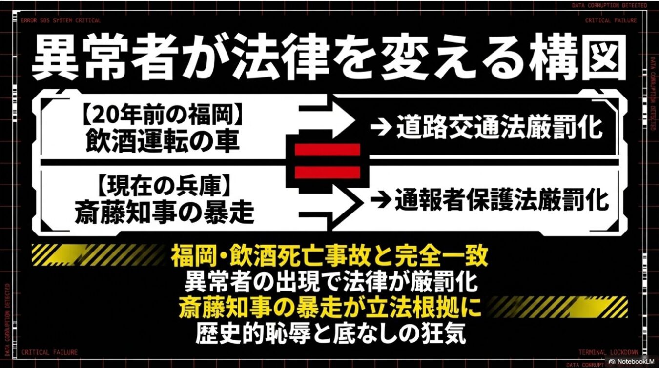 • 「元彦法」という歴史的恥辱: 自身の不祥事が公益通報者保護法厳罰化の根拠になる異常事態。それは悲惨な飲酒運転事故が道交法を変えたのと同じ「異常なバカによる社会の破壊」である。