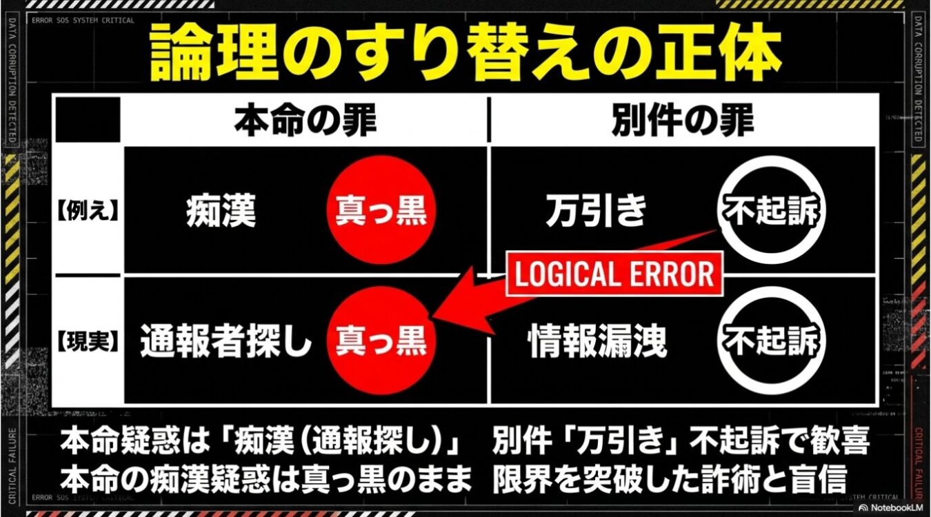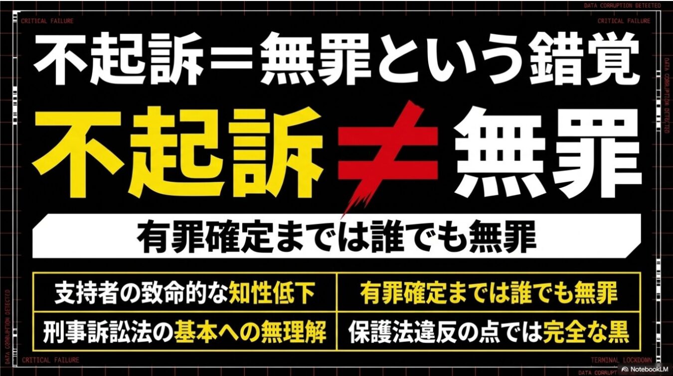 • 不起訴=無罪という田舎者の錯覚: 「痴漢の最中に万引きが不起訴になった」だけで無罪を叫ぶような、支持者たちの限界突破した知性の低さが地獄を加速させる。