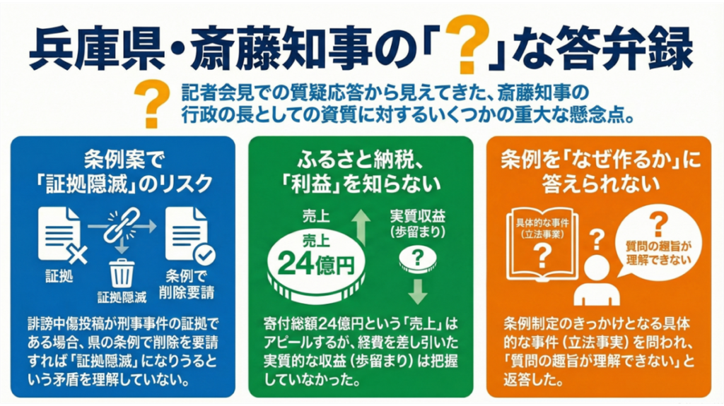 さらに、条例を作る根拠となる「立法事実」を問われて「質問の趣旨が理解できない」と答えた一件は、事態の深刻さを物語っています。この反応が特に問題視されたのは、知事自身が2年前、元明石市長との会話が流出した個人的な経験を挙げ、それこそが条例制定の「立法事実」だと明確に語っていたからです。自身の選挙陣営に関わる不都合な事案に話題が及ぶと途端に見せたこの「記憶喪失」は、単なる無知ではなく、一貫性のないご都合主義的な姿勢を露呈させ、法案提出者としての適格性そのものを根底から揺るがしました。