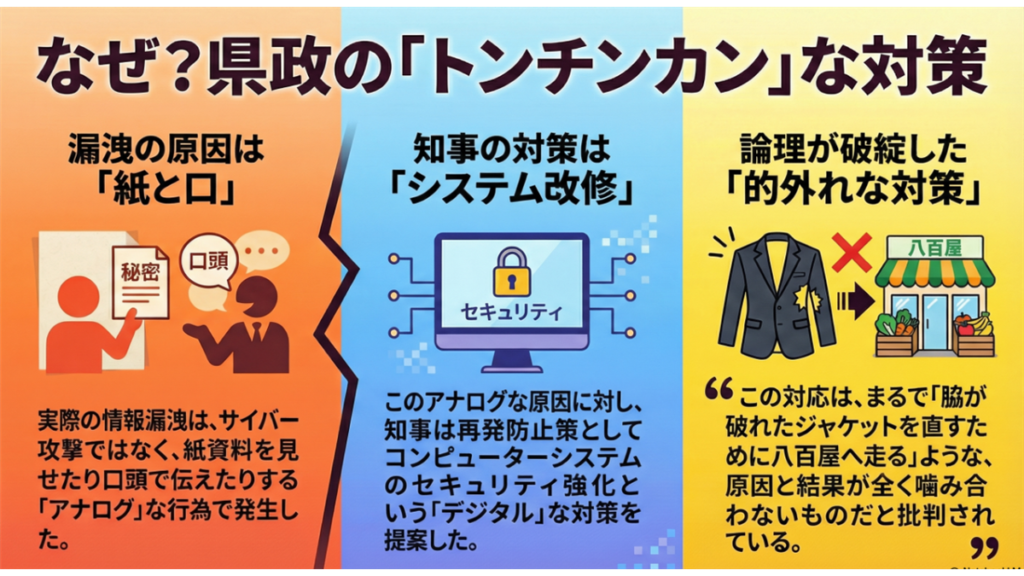 ここには、原因と結果の分析における完全な破綻が見られます。サーバーのセキュリティをいくら強化しても、「紙を持ち出して話す人間」を止めることはできません。原因と対策が全く噛み合っていないのです。この対応は、問題の本質を分析せず、聞こえの良いステレオタイプな解決策に飛びつく「思考停止」の典型例として厳しく批判されています。