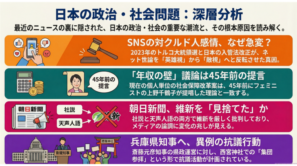 2. 入管法改正議論: 日本の通常国会で入管法の改正が議論された際、立憲民主党が反対論の具体例としてクルド人の名を挙げた。これが、国内の政敵を叩くための格好の「弾薬」を、特定の勢力に提供してしまった。