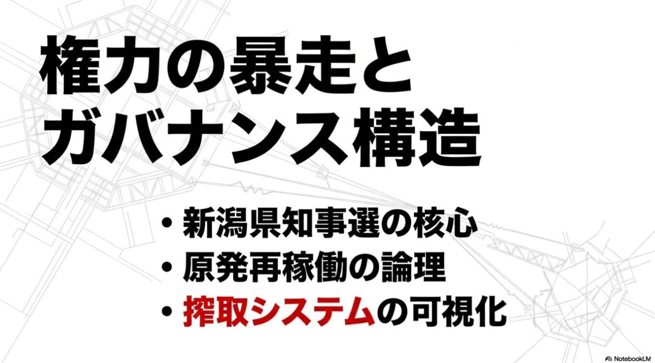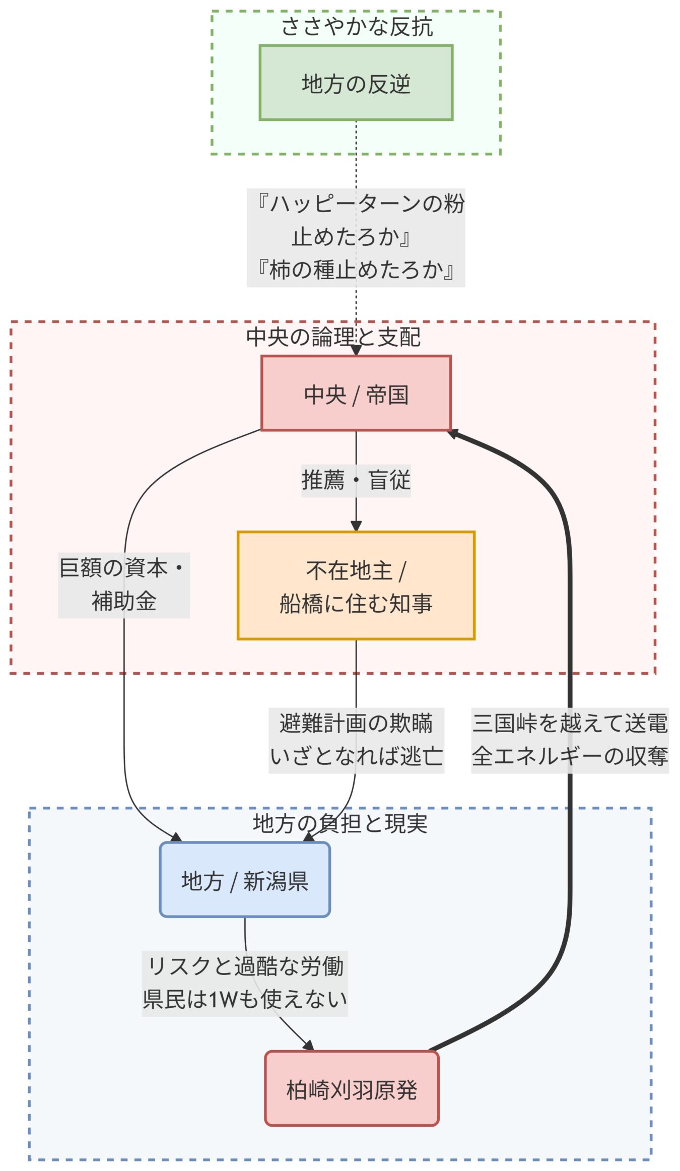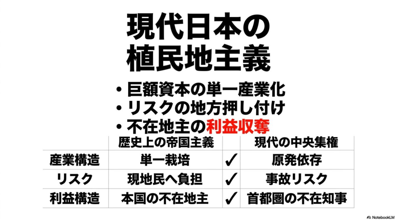 新潟県民が「1ワットたりとも」使えない東京のための原発を、千葉県船橋市に住む知事が動かそうとする圧倒的な不正義。自民・公明が地方に強いるこの構造は、帝国が東南アジアで行った「植民地主義(プランテーション)」と全く同じであり、地方は麻薬の密売人(プッシャー)のように中央へ牙を剥くべきである。