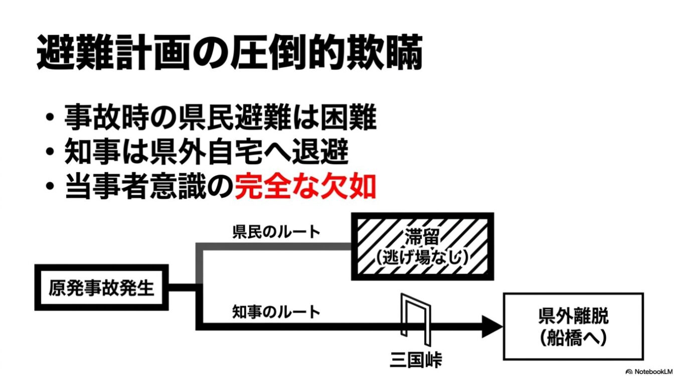 原発が動くとなれば、当然自治体は避難計画を作らなければなりません。しかし、自宅が船橋にある知事は、いざ事故が起きたら三国峠を越えて関越道に乗り、さっさと船橋へ逃げ帰ってしまえばおしまいやんけ。