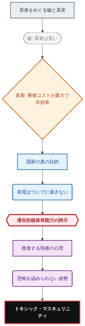 【結論】 原発が「安い」という言説は完全なデマであり、国家がこの極めて非効率なシステムを維持する真の理由は「潜在的な核保有能力の誇示」に他ならない 。そして、この虚構を無批判に礼賛するのは、自身の弱さを直視できず「恐怖を認められない」という幼稚な虚勢(トキシック・マスキュリニティ)にすがる弱者たちである