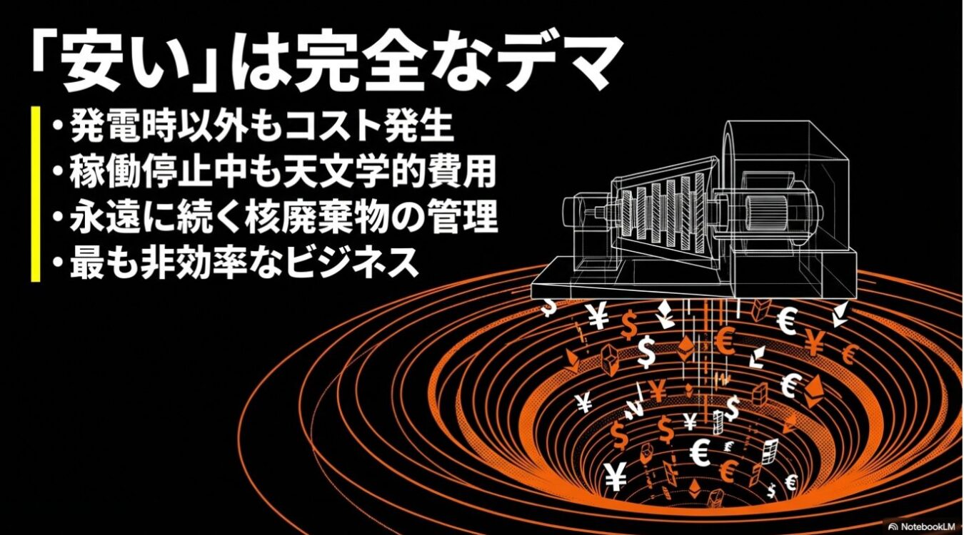 • ビジネスの鉄則において、付加価値を生む瞬間以外に莫大な事後コストがかかる原発は最悪の非効率モデルである 。