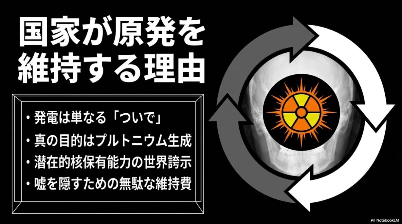 電力を得るだけなら、他にいくらでも効率的で安い手段がある。 では、なぜ国家はわざわざあんな非効率な原発を回し続けるのか。 結論から言えば、発電など「ついで」に過ぎない。