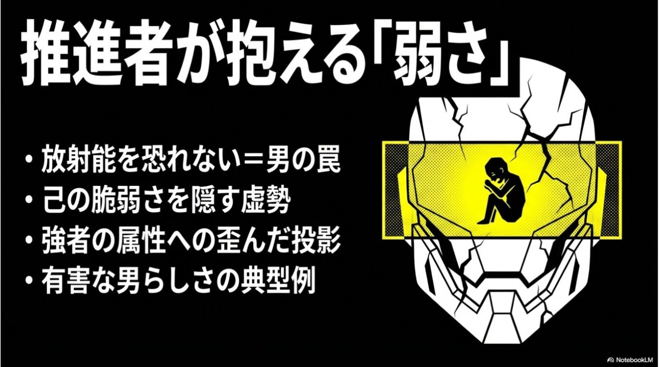 己の脆弱さを認める勇気がなく、単に『強者の属性』に自己投影して虚勢を張りたいがために、『リスクを無視する蛮勇』を男らしさと履き違えているのだ。 これこそが「トキシック・マスキュリニティ(有害な男らしさ)」の典型である。 彼らにとって原発とは、社会で何者にもなれなかった自分を、いっぱしの知識人のように見せかけてくれる都合の良い「自己欺瞞のオモチャ」に過ぎないのだ。