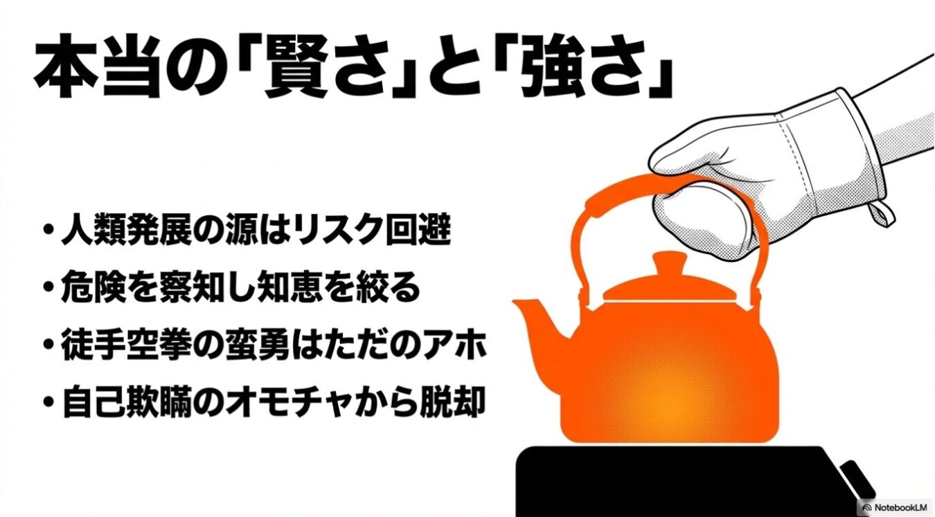 人類がなぜ発展したかといえば、「怖い」という感情を持ち、リスクを回避する知恵を絞ってきたからだ。 沸いているかどうかもわからないやかん(薬缶)に対して、ミトンやタオルを使って慎重に触る人間が「賢い」のである。 それを、「お前ら怖がりすぎやねん」と素手で触りに行くのは、男らしいのではなくただの「アホ」である。