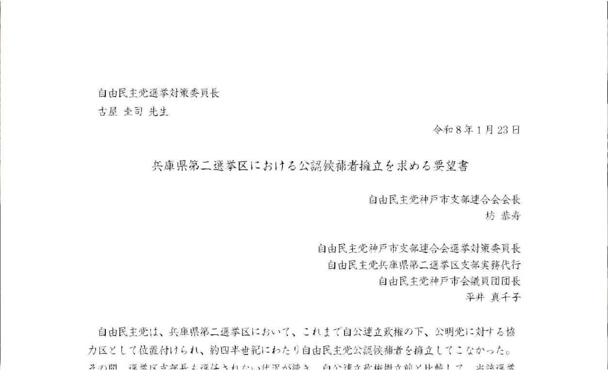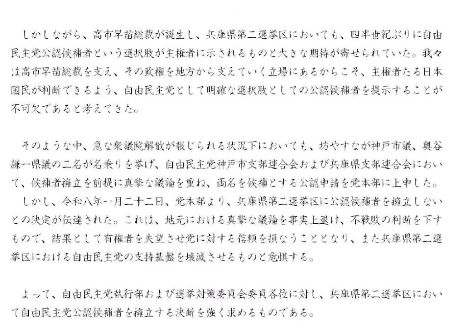 - 地元の総意: 神戸市連および兵庫県連は、真摯な議論を重ね、両名を候補として党本部に上申した。