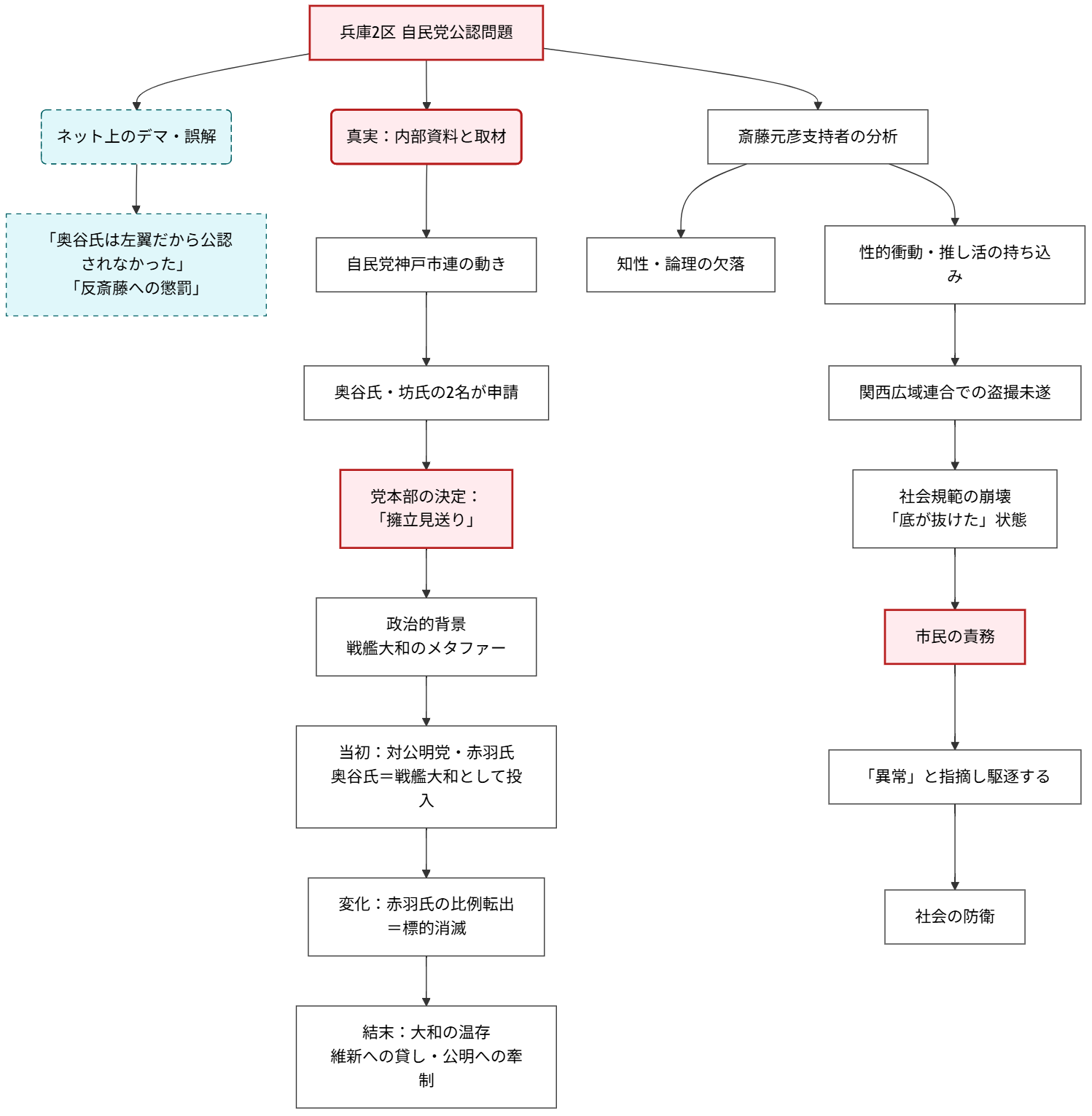 【結論】 ネット上で拡散されている「奥谷謙一氏が左翼だから自民党公認を外された」という説は、完全なるデマである。事実(内部資料)は、奥谷氏と坊やすなが氏の両名が公認申請を行ったものの、党本部が「小選挙区に候補者を擁立しない」という高度な政治的判断を下したに過ぎない。また、斎藤元彦知事の支持者たちが見せる行動は、政治的信条に基づくものではなく、性的衝動や窃視症(ピーピング・トム)に近い異常な心理状態にあり、社会の底が抜けた状態にあると断言できる。