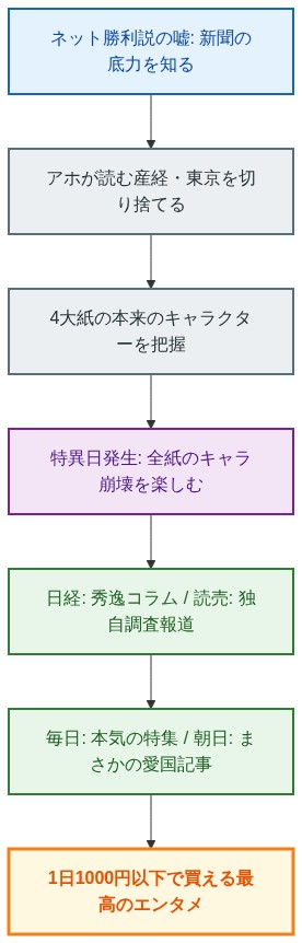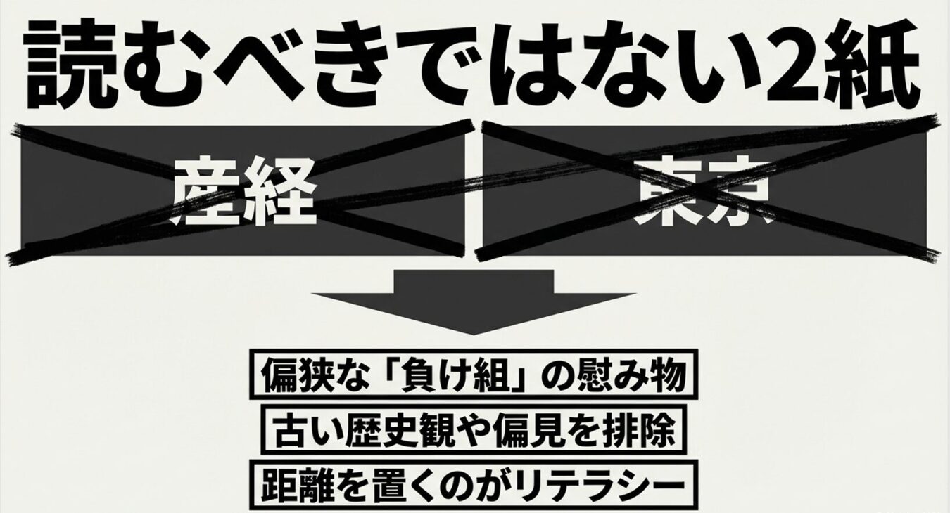 - 避けるべき「負け組」新聞: 産経新聞(田舎の負け組)と東京新聞(都会の負け組)は読むに値しない。この2紙を除いた4大紙を読み比べることこそが、真のメディアリテラシーを鍛える王道である。