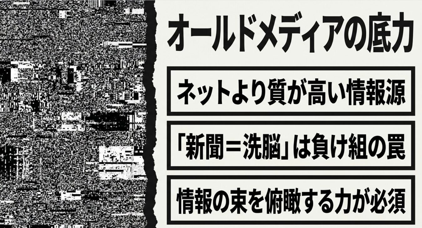 「新聞を読むと洗脳される」「本を読むとバカになる」などとドヤ顔で語るのは、視野の狭い「田舎の負け組」特有の逆張りに過ぎない。 それは、活字に対する根拠のない恐怖心やコンプレックスをすり替えているだけであり、新聞という「情報の束」を俯瞰する能力の欠如を自白しているも同然である。