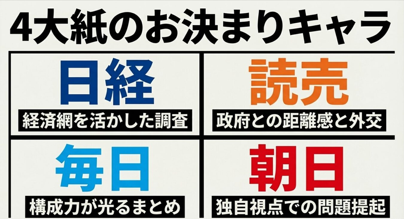 上述した新聞を除外した上で、我々が目を通すべきは「日経、読売、毎日、朝日」の4大紙である。 これらの新聞には、長い歴史の中で培われた確固たる「キャラクター(得意分野)」が存在する。