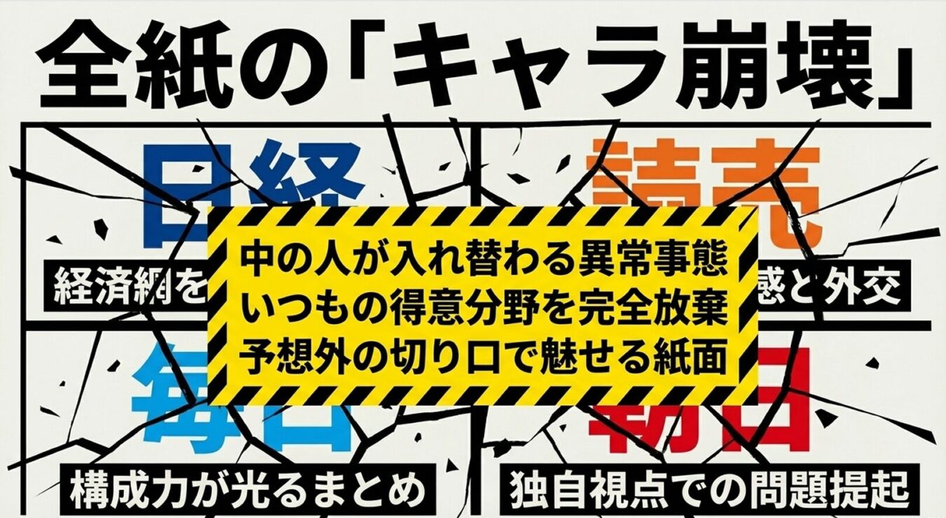 そう思っている人にこそ、知ってほしい「新聞の痛快な楽しみ方」があります。 日経、読売、毎日、朝日といった各紙には、長年培われた「お決まりのキャラクター(得意分野)」が存在します。しかし、稀に全紙がそのキャラを一斉にかなぐり捨て、予想外の切り口で紙面を構成してくる「面白すぎる特異日」があるのです。